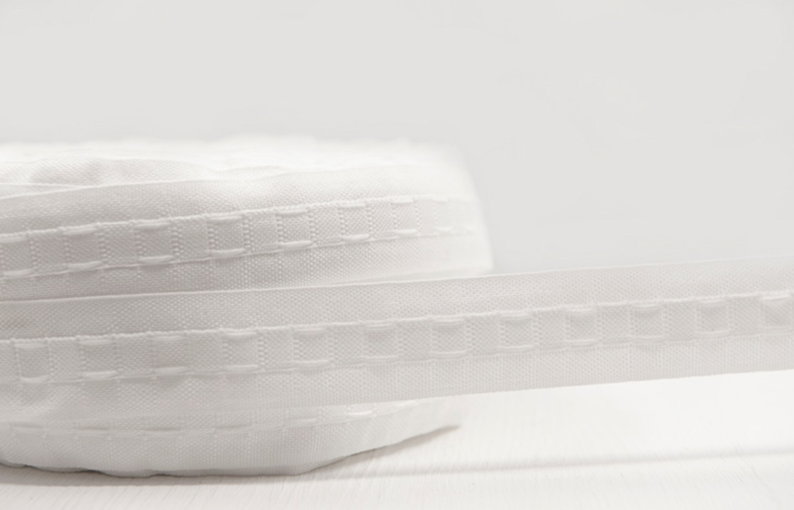 £0.601″/25mm wide white curtain tape with 2 strings.