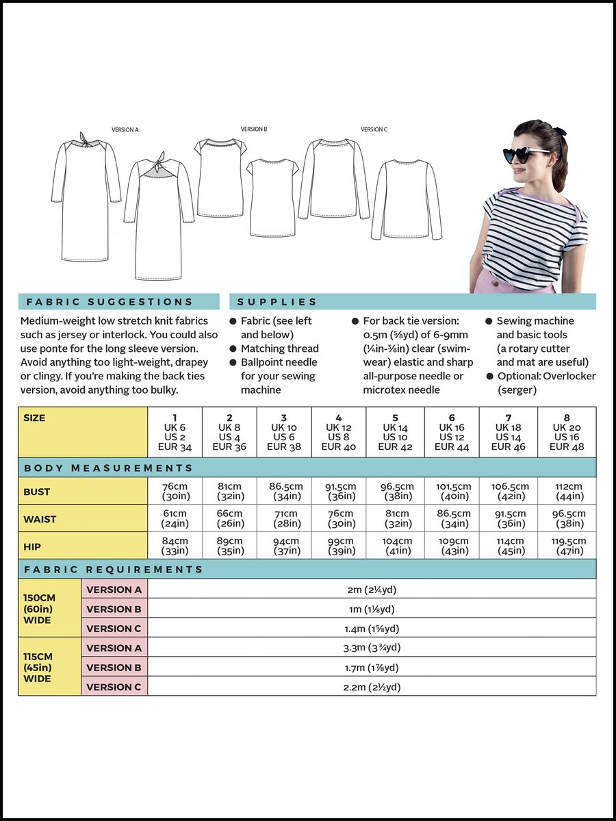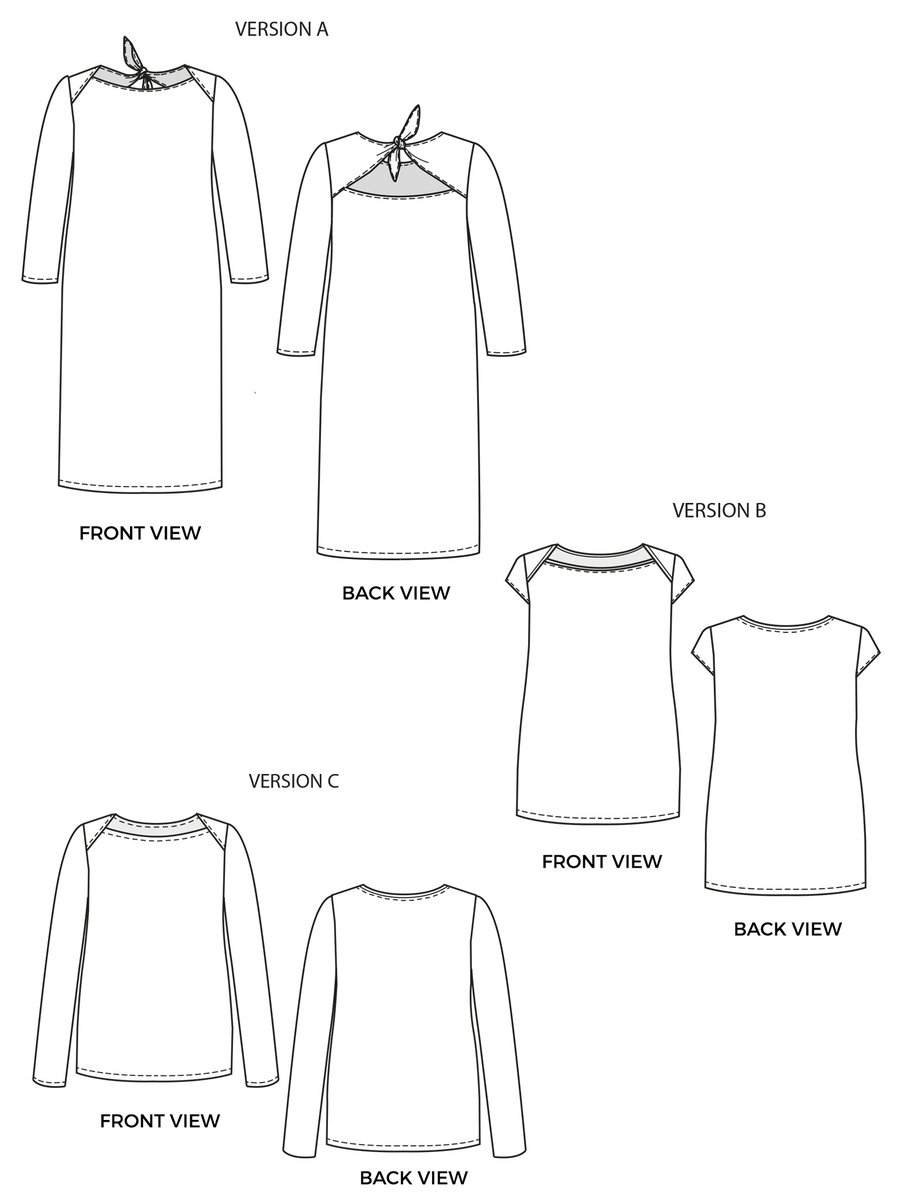 Upgrade your casual me-made wardrobe with this stylish (and comfy!) top and dress. The optional back ties or contrast binding add a fun twist to the classic Breton or t-shirt dress.