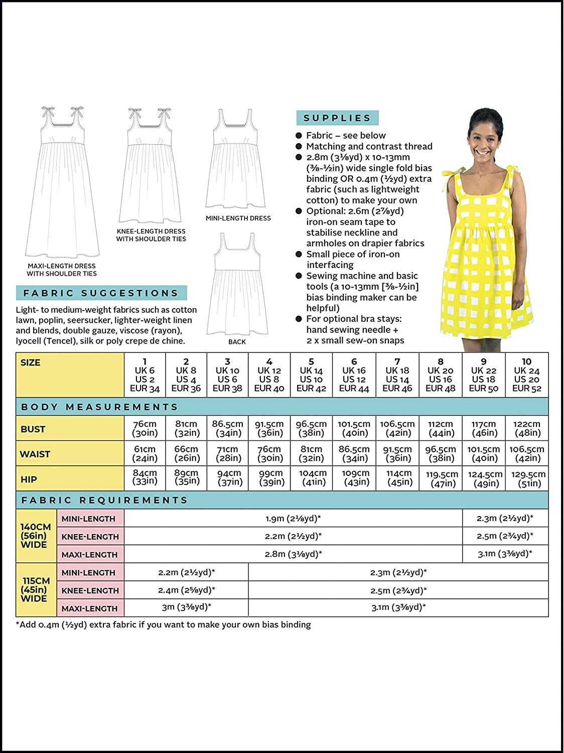 The slightly square scoop neckline is designed to cover a bra, with optional bra strap stays for added security. Add the optional faux ties to the straps for an extra touch of whimsy. Choose from mini-, knee- or maxi-length hemlines for the floaty, gathered skirt. And, of course, it has side seam pockets for your ice cream money!