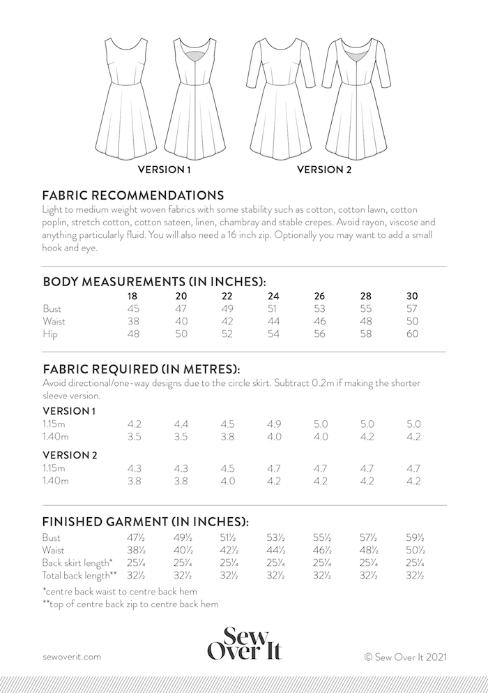 The Betty Dress is sized between UK sizes 6-30. See the chart for details on fabric requirements.