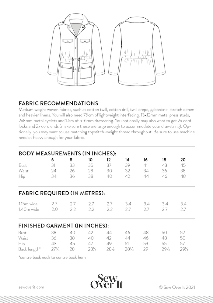 The Dorothy Jacket sewing pattern is sized between UK sizes 6-30. The pattern is split into two different blocks: sizes 6-20 (B Cup), and sizes 18-30 (D Cup). See the chart for details on fabric requirements. Like all sew over it patterns, the sizes are nested to make it easier to grade between the sizes, depending on your measurements.