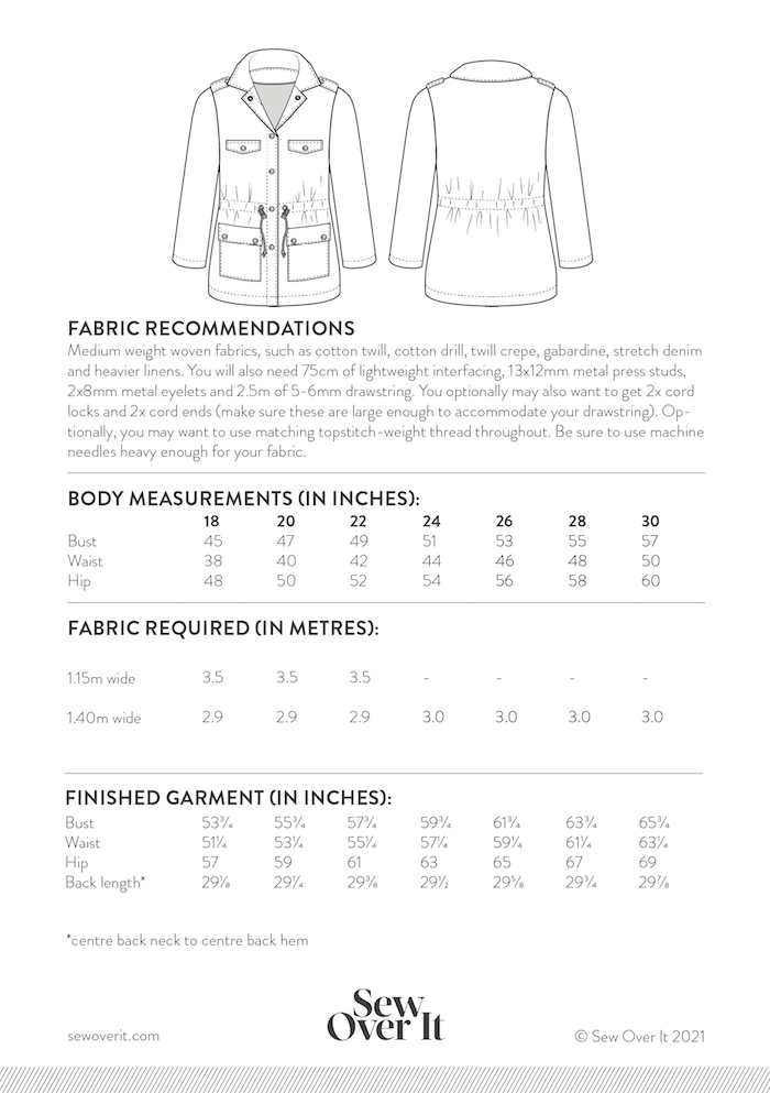 The Dorothy Jacket sewing pattern is sized between UK sizes 6-30. The pattern is split into two different blocks: sizes 6-20 (B Cup), and sizes 18-30 (D Cup). See the chart for details on fabric requirements. Like all sew over it patterns, the sizes are nested to make it easier to grade between the sizes, depending on your measurements.