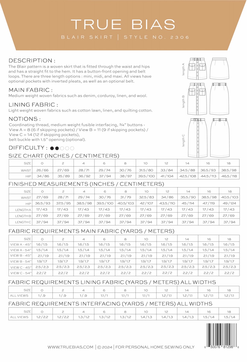 £23.99The Blair pattern is a woven skirt that is fitted through the waist and hips and has a straight fit to the hem. It has a button-front opening and belt loops.